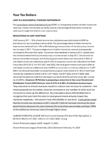Your Tax Dollars LGDF IS A SUCCESSFUL FUNDING PARTNERSHIP The Local Government Distributive Fund (LGDF) is a designated portion of state income tax revenues. Cities and counties currently receive a percentage of total state income tax revenues through this fund on a per capita basis. REDUCTIONS IN LGDF CONTINUE Until January 2011, 10% of total income tax collections was dedicated to LGDF for distribution to municipalities and . . .