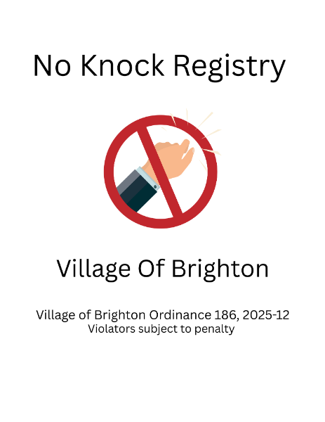 October 6, 2025, Peddler Ordinance 2025-12 passed to increase fees and penalties, and created a No Knock Registry. You can sign up for the No Knock Registry by calling 618-372-8860 or emailing to ptclerk@brightonill.com. You can find more information about the Peddler Ordinance 2025-12 at www.brightonill.com under Village Code.