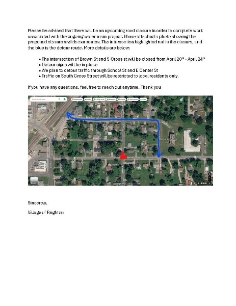 Please be advised that there will be an upcoming road closure in order to complete work associated with the ongoing water main project. The intersection of Brown Street and South Cross Street will be closed from April 20th through April 24th. Detour signs will be in place. Traffic will be detoured through School Street and East Center Street. Traffic on South Cross Street will be restricted to local residents only. If you have any questions, feel free to reach out anytime. Thank you.